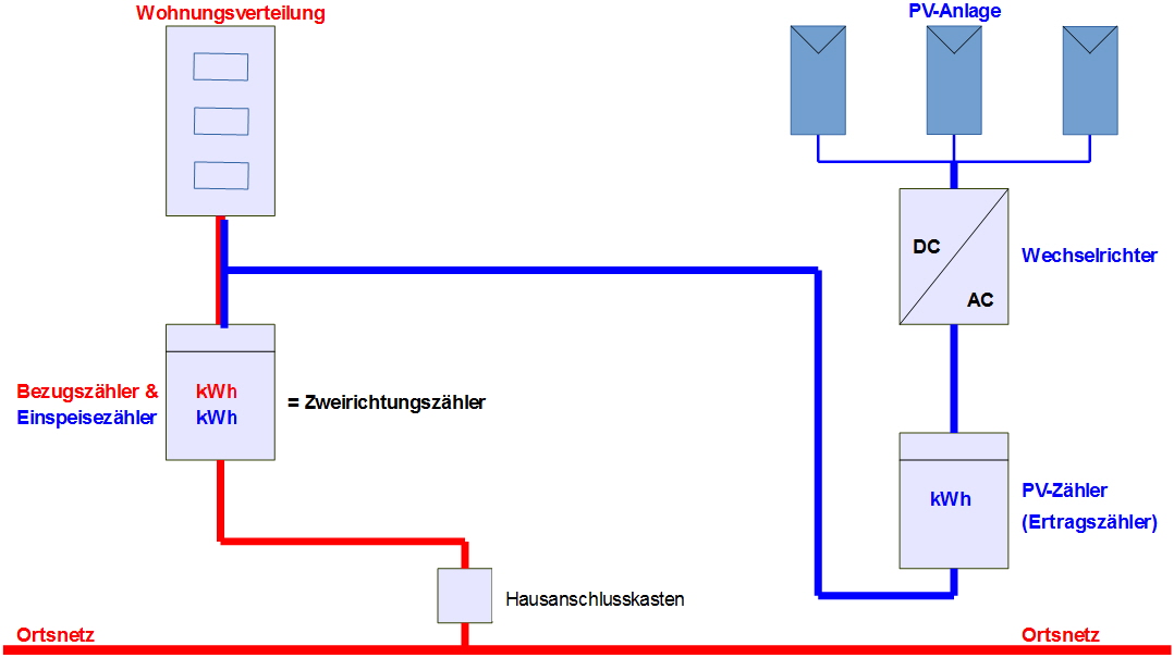 Die überschüssige Leistung fließt dann ins öffentliche Stromnetz. Wenn der vorhandene Stromzähler keine Rücklaufsperre besitzt, zählt er jetzt rückwärts.