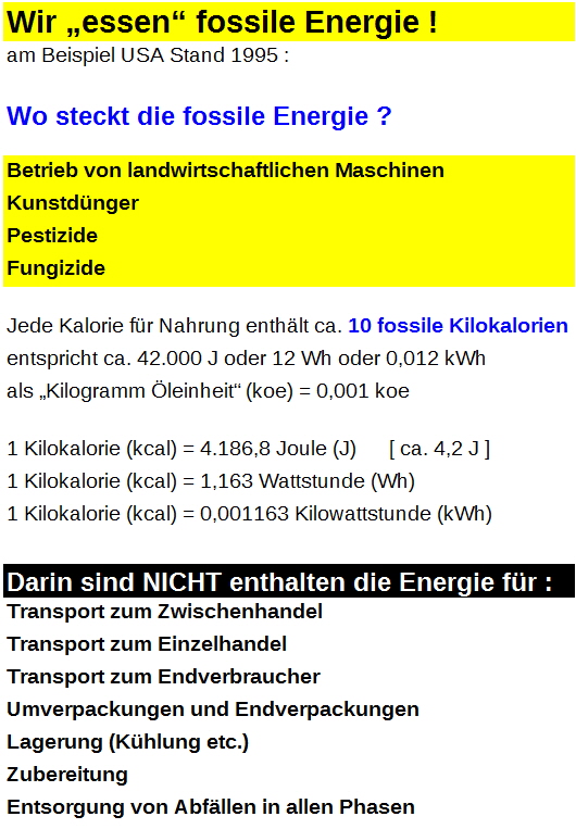 Nahrungsmittel "enthalten" Diesel für die Traktoren usw. für praktisch alle Arbeitsschritte verbrauchen. Beheizte Treibhäuser schlagen mit 0,5 bis 1 Liter Heizöl pro kg "zu Buch".