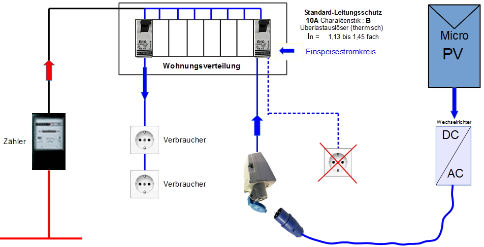 Weder für eine Überlastung der Leitung , noch für den Kurzschlussfall muss bei einer korrekten Leitungslänge in Bezug zu ihrem Querschnitt, der Leitungsschutzschalter NICHT verändert werden. Damit entfällt der Eingriff in die betreffende Verteilung in Gänze. War also der ausgewählte Stromkreis lediglich mit einer einzigen Steckvorrichtung ausgestattet, muss lediglich diese Steckdose so angepasst werden, dass der Stecker der Klein-PV nur explizit an dieser Steckvorrichtung genutzt werden kann.