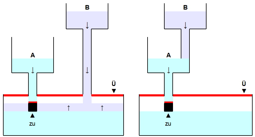 Mit ein wenig Fantasie kann sich hoffentlich jeder vorstellen der Rechte "Topf" 1.) wird auch dann überlaufen, wenn "Schwimmerschalter" den Zulauf von "A" bereits verschlossen hat. Warum ? Weil aus "B" weiter ungehindert Wasser nachfließt und "B" eben keinen eigenen "Schwimmerschalter hat.